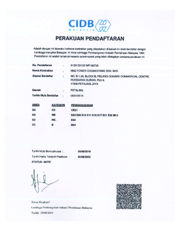 ST (TKL) KE/1046462K - Ministry of Finance Malaysia K2215248481302300 - CIDB G2 ME E04 G3 ME E11 E06 |
